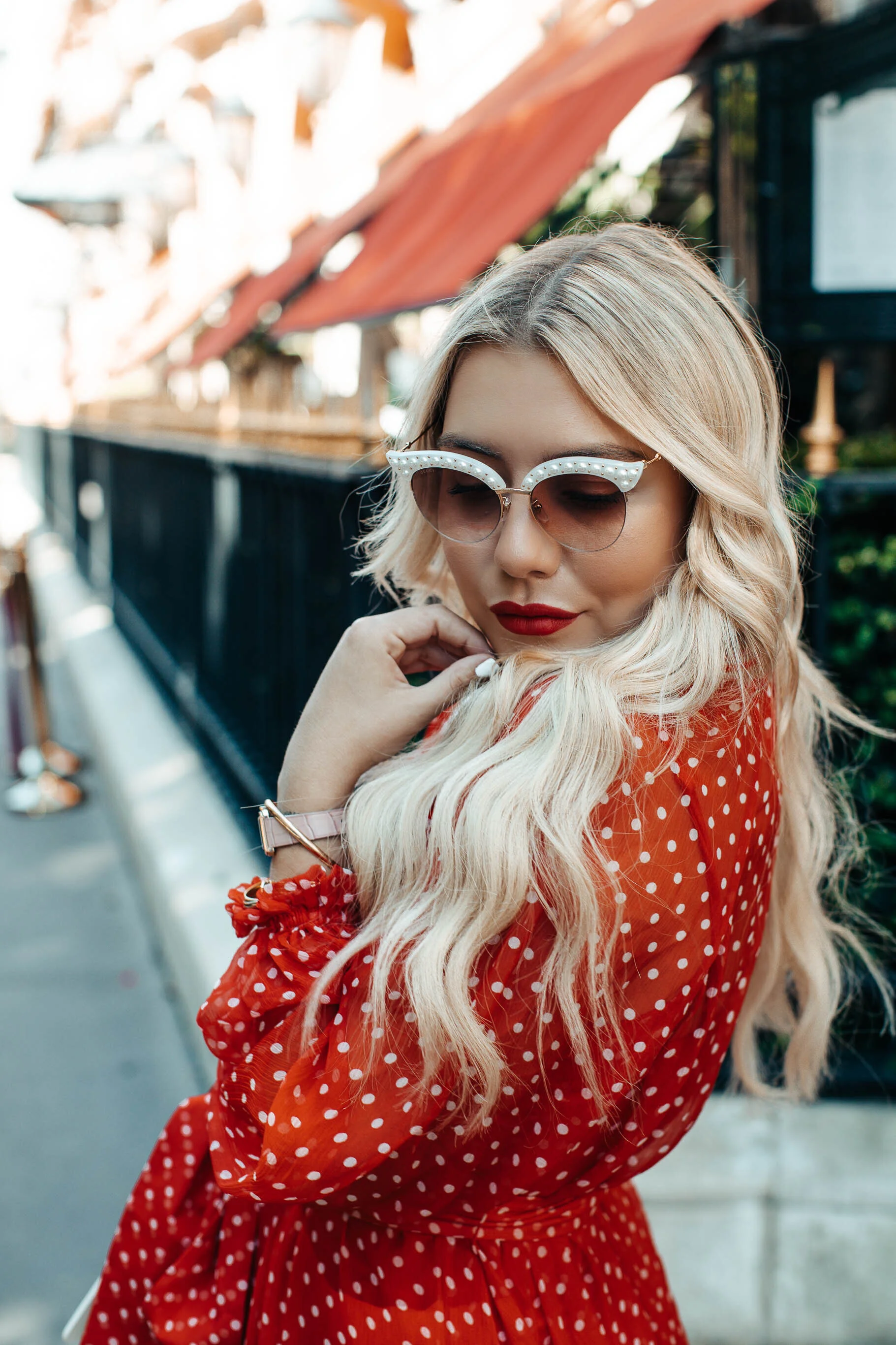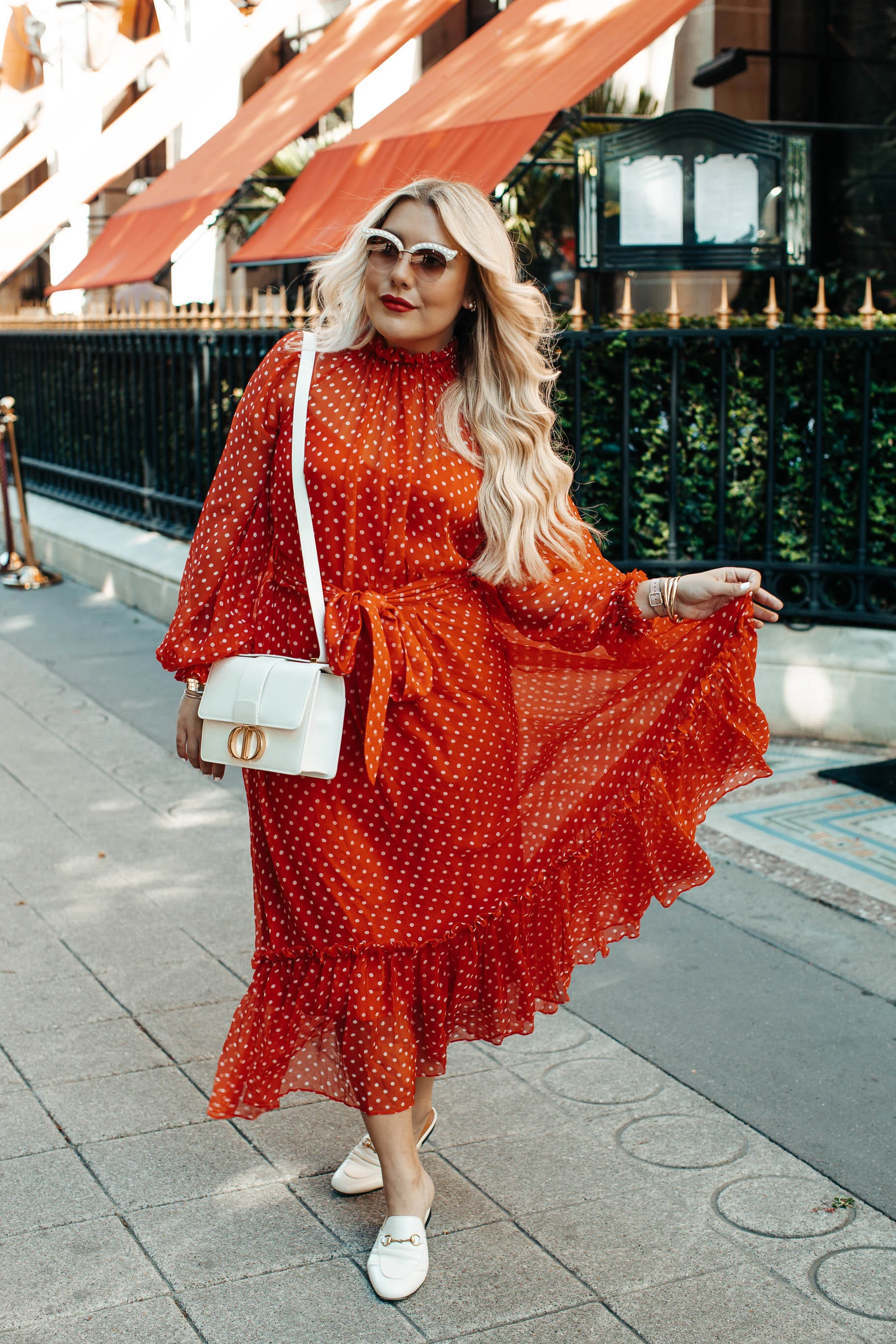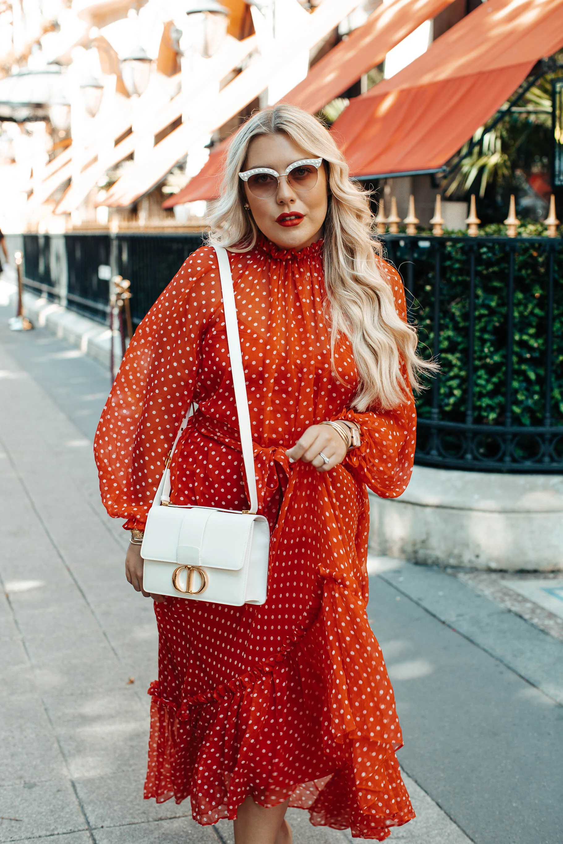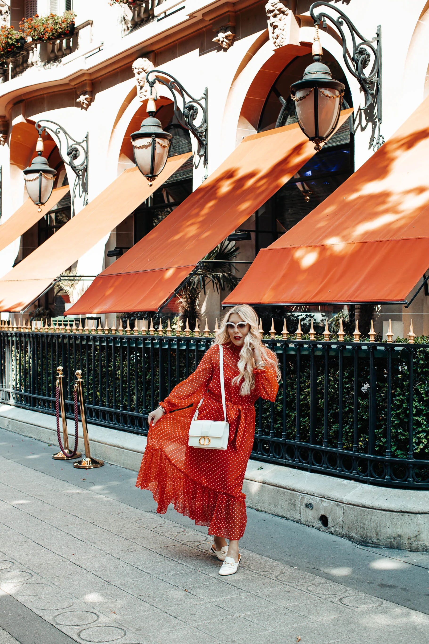Gucci sunnies and slides, Zimmermann dress, and Dior “30 Montaigne” bag.