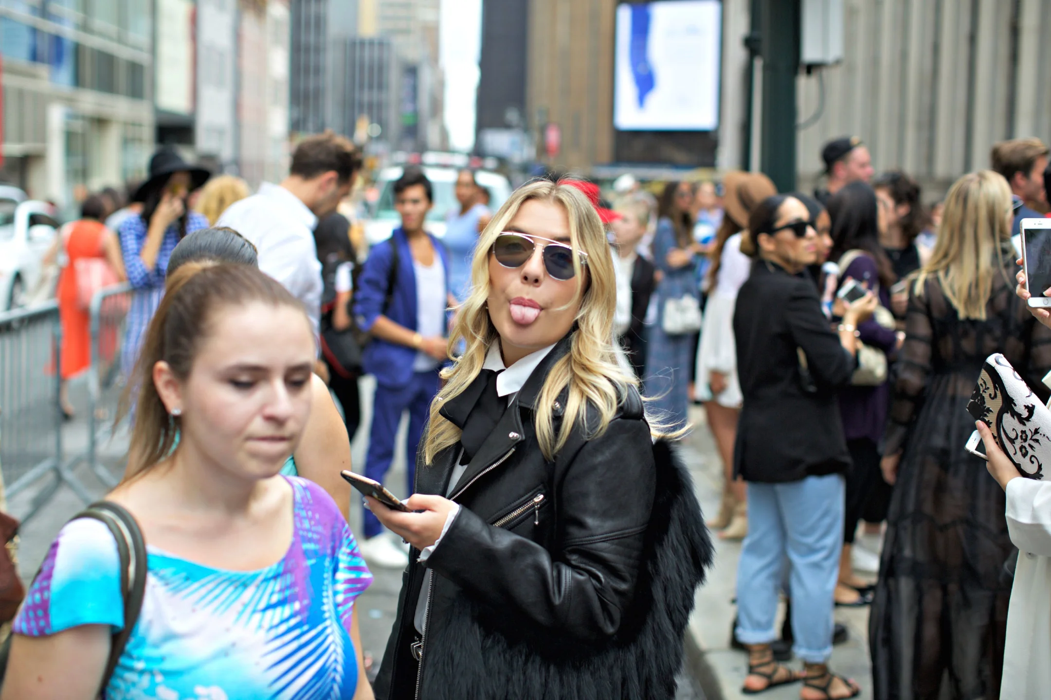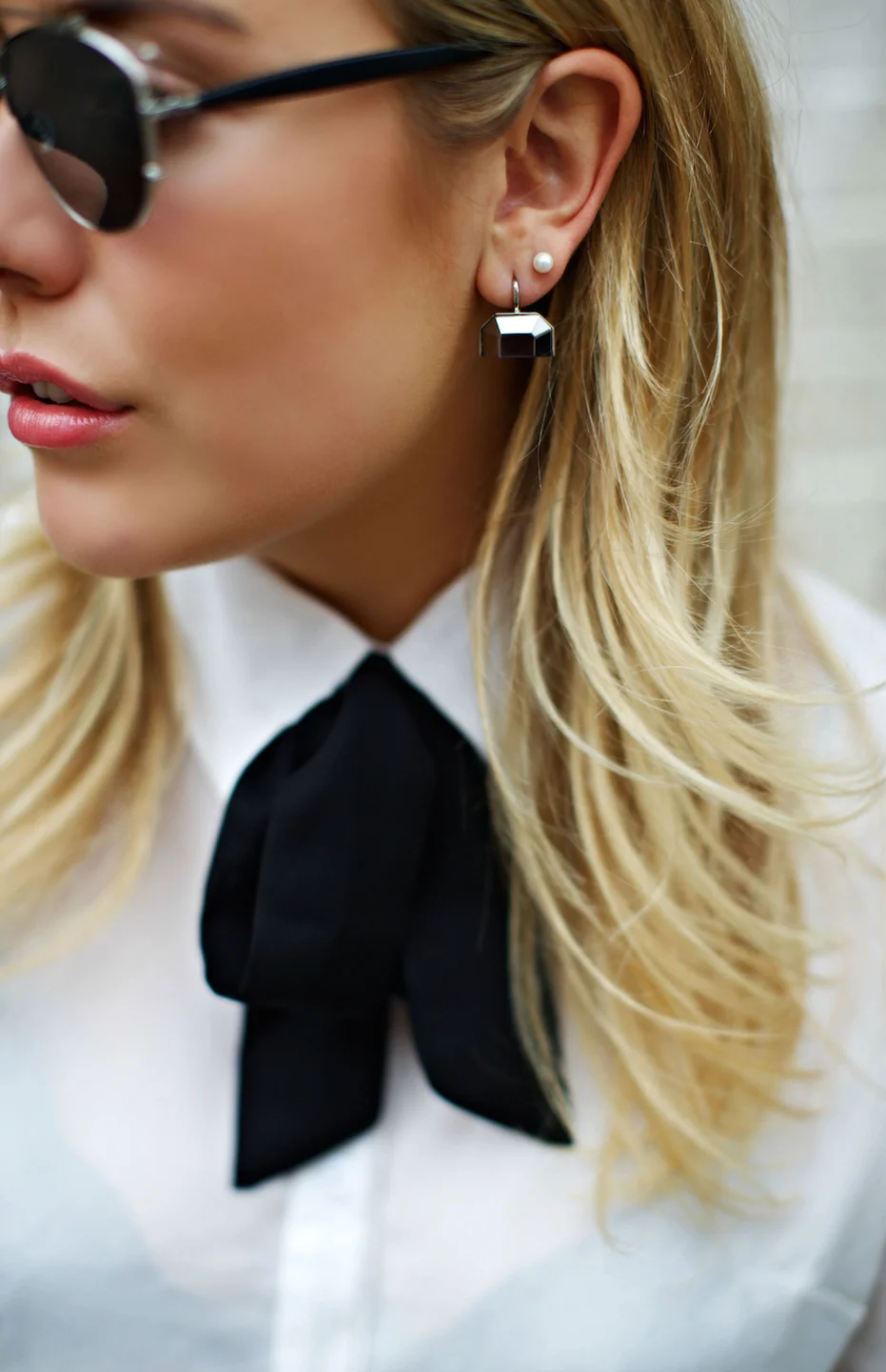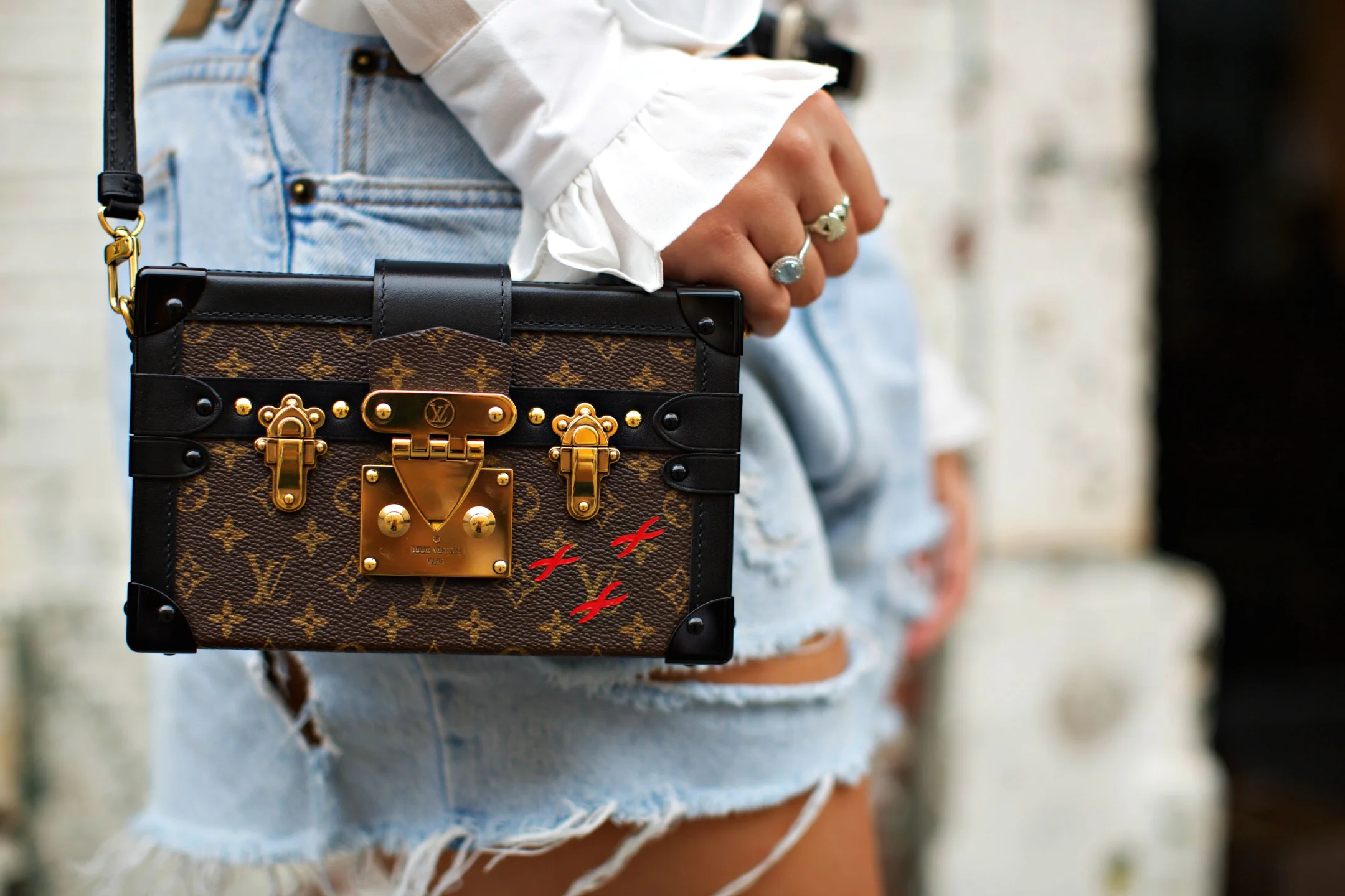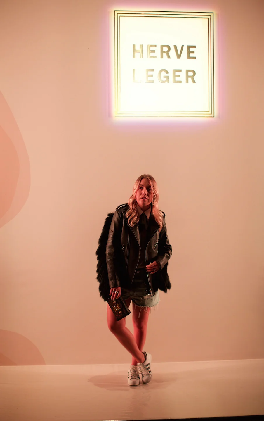 Dior "Technologic" sunglasses and missmatched earrings, Alexander Wang jacket, Nasty Gal blouse, Zara belt, vintage Calvin Klein shorts, Louis Vuitton "Petite Malle", and Balenciaga boots later switched for Adidas "Superstar" sneakers.
