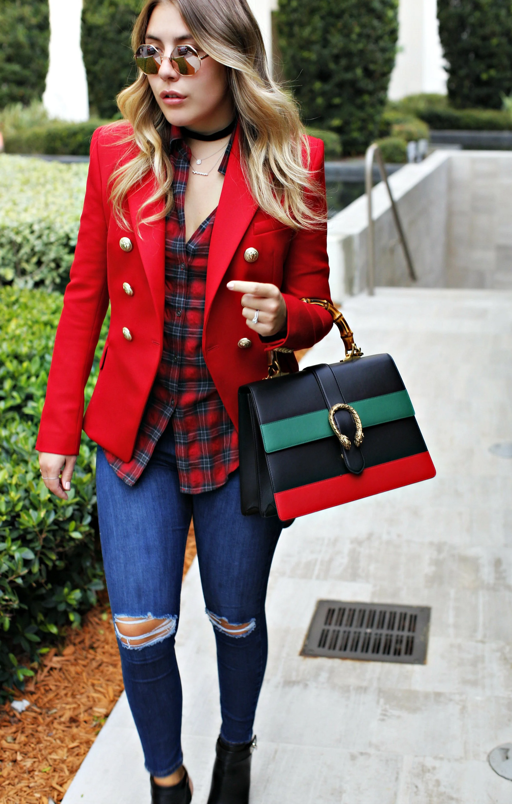 Curtler & Gross sunglasses, Deux Lion choker, Balmain blazer, Elizabeth & James shirt, Topshop jeans, Gucci "Dionysus" bag, and Givenchy shoes.