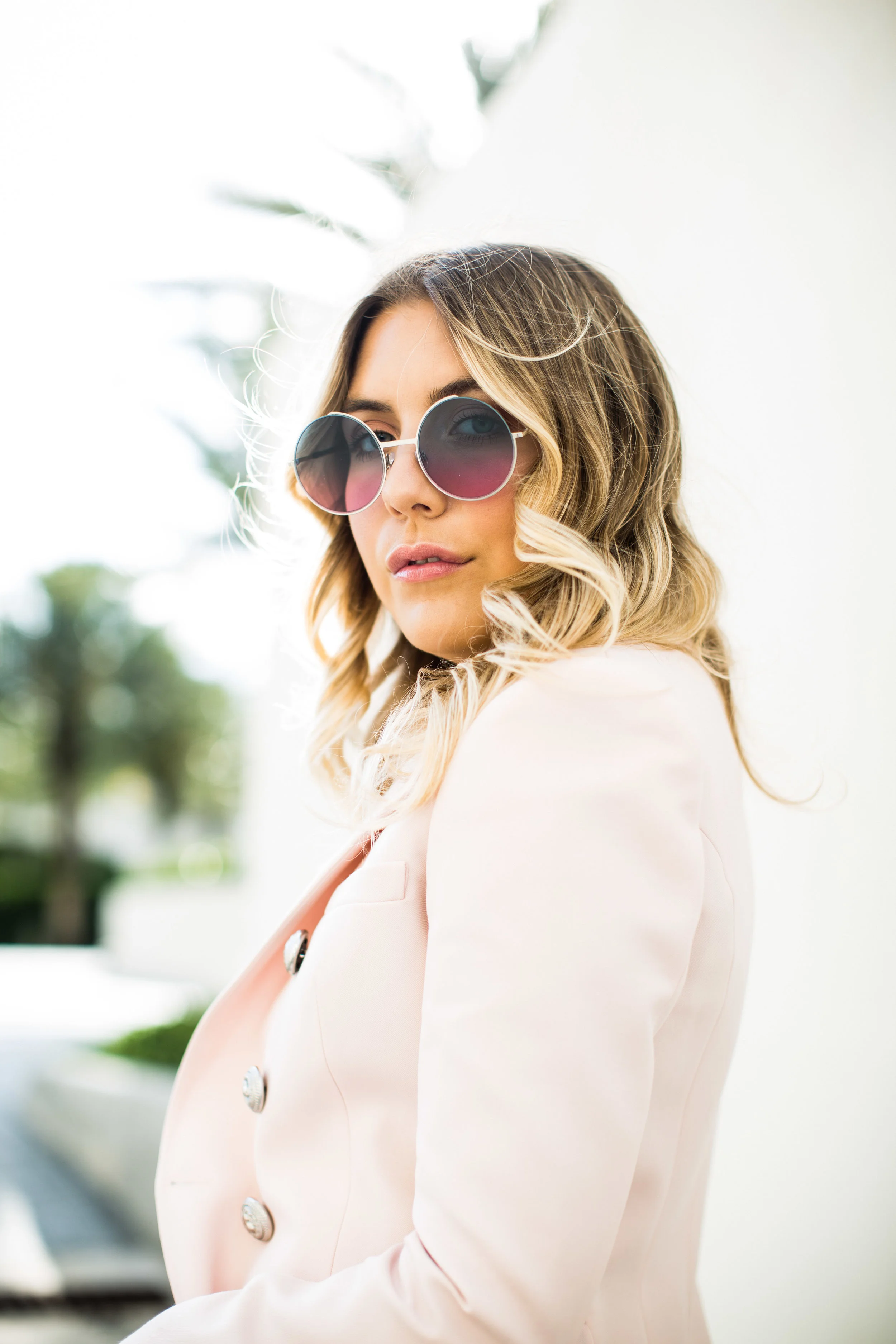 Marc Jacobs sunglasses, Fallon choker, Balmain blazer, WhoWhatWear X Target blouse, One Teaspoon shorts, Louis-Vuitton backpack, and Christian Louboutin sandals.