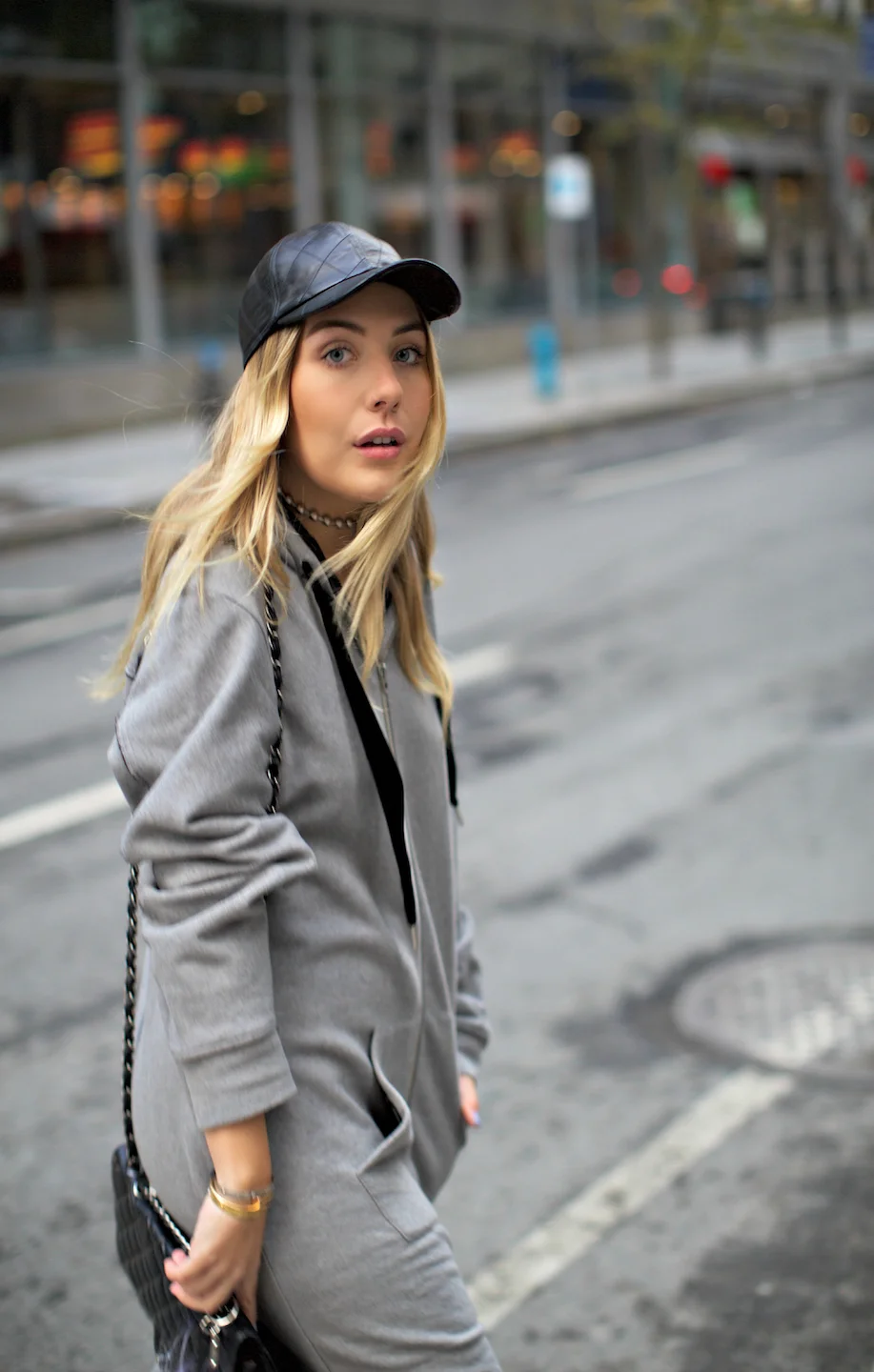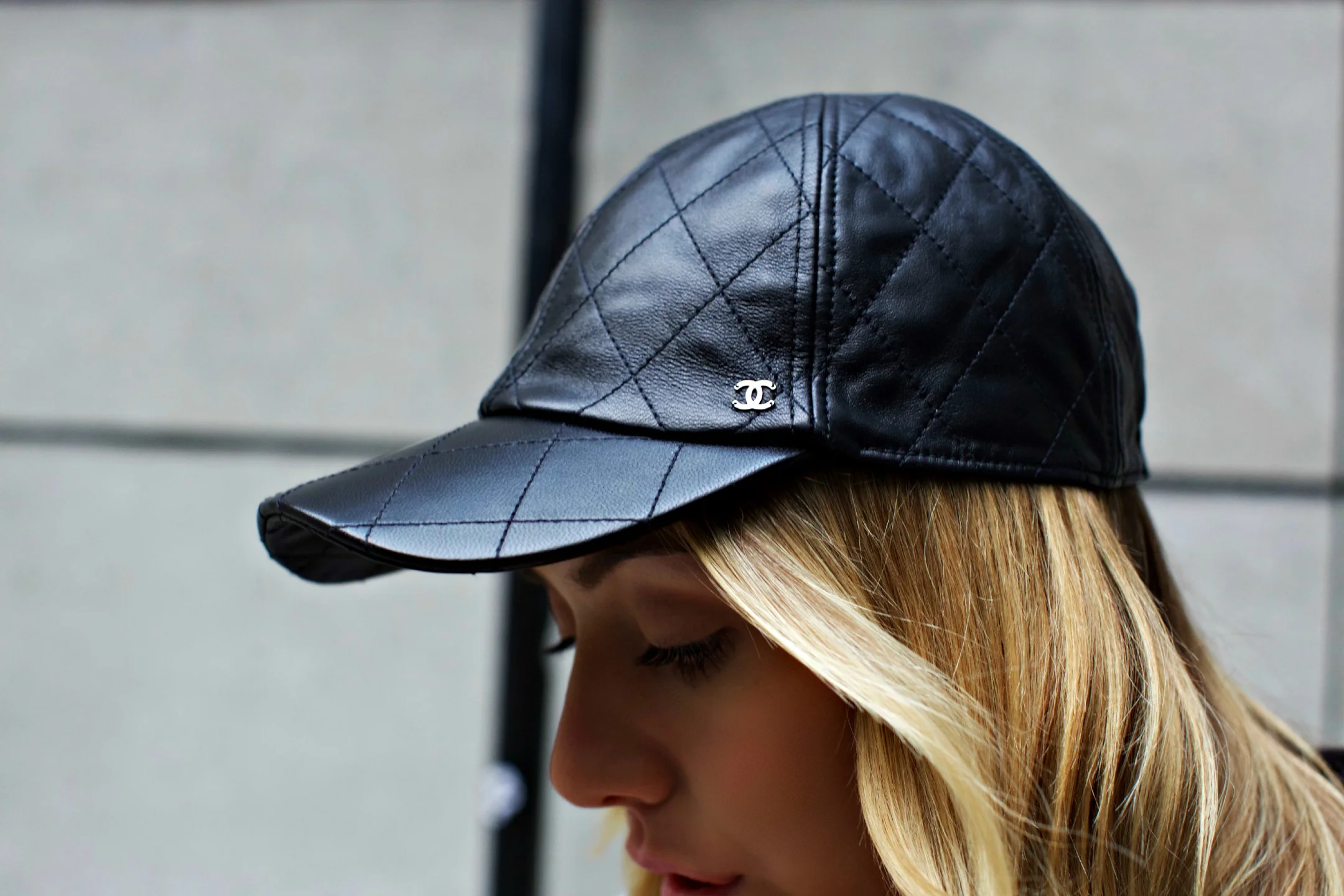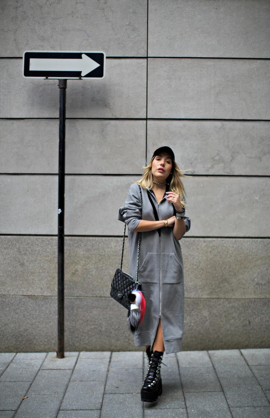 Chanel baseball cap and bag, Nasty Gal choker, David Yurman, Hermes and Cartier bracelets, Apple Watch, Fendi Karlito, and Alexander Wang sweater dress and platform boots.